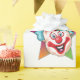 A cute and funny (or creepy and scary!) cartoon painted clown face with a red nose.