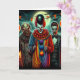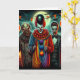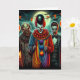 Scary colourful psychedelic comic book style clown holding a balloon Halloween card. With inside pun and colouring page.