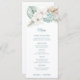 Showcase your beach reception menu with this beautiful coastal formal dinner menu. This design has a watercolor image of a winter floral arrangement with white poinsettias and tropical foliage. Colors used include, slate blue, forest green, ivory and tan.