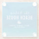 This coastal themed typography design can be customised with your last name, first names, and date. A sailing ship and text are placed on top of an aerial photograph of the sea. The bluish white typography includes the words "BEACH HOUSE" plus name and date templates set in a San Serif and hand written script font. The colours of the text and ship (a) can be changed in the Edit Menu.