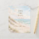A watercolored sandy beach, sand dunes, ocean waves background. Personalize and add a date and your names. The text: Save the Date is written with a large trendy hand lettered style script.