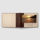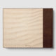 A guest book featuring your custom photo framed by a dark brown faux leather and sand stylised design.