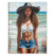 This notebook features a stunning African American woman with voluminous, curly hair, standing confidently by the beach. She wears a stylish black cowboy hat, a white lace-trimmed crop top, and denim cut-off shorts, blending a chic, bohemian vibe with coastal flair. Her radiant skin glows under the bright sunlight, and her serene expression adds a sense of calm and confidence to the scene. The background showcases a picturesque seascape with dynamic waves rolling onto the shore, framed by tall beach grasses. The combination of the beach’s natural beauty and the subject’s bold, modern style creates a refreshing, summery aesthetic that’s both relaxed and empowering.