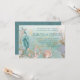 Elegant, unique hand-painted watercolor under the sea wedding theme in dark teal, rose gold, and mint green. The design features seashells, starfish, a seahorse, and coral reef in complimenting shades of deep green and coral with a splash of mint green for a water effect. The details in dark green modern lettering are framed by the nautical watercolor garland border of coral, shells and starfish.