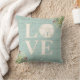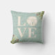 A Christmas throw pillow Showcasing the word LOVE. Decorated with a sand dollar, beach grasses, berries and a weathered wood background for your Christmas Beach decor.