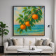 Artwork of an orange tree branch with a beach in the background. A sunlit branch heavy with ripe oranges stretches gracefully over a tranquil turquoise ocean, blending the warmth of summer fruit with the calm rhythm of the sea. The pastel tones of peach, teal, and green glow softly, evoking the scent of tropical salt air and citrus blossoms. The art style is lush and painterly, with visible texture that gives the water a gentle, inviting motion. The colors are highly saturated, giving the piece a feeling of intense, sun-drenched warmth and vitality. Ideal for a kitchen, dining area, or a living space where you want to evoke a coastal feeling. It complements both modern decor and classic rustic styles. This piece can be customized, printed, and or downloaded.