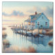 This peaceful illustration captures a charming blue coastal cottage nestled beside a calm marsh, bathed in the soft light of sunrise. The artwork evokes a sense of stillness and solitude, with gently swaying reeds, a weathered dock, and mirrored reflections in quiet waters. Warm pastel tones blend seamlessly with cool blues, creating a serene watercolor scene that brings coastal tranquillity indoors. The dockside composition and rustic charm of the blue house add nostalgic appeal, perfect for those drawn to seaside home decor and slow living aesthetics. Ideal for creating a calming focal point in any space, this piece celebrates the quiet beauty of marshland landscapes and coastal sunrises. AI generated artwork.