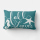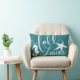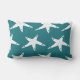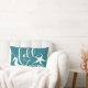 Coastal themed fall lumbar pillow featuring ocean green, white seahorse, and starfish silhouettes.