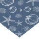 Coastal Fall table runner featuring pumpkin, starfish seashell and coral in white on a nautical navy blue background. Perfect for beach themed autumn entertaining and Thanksgiving celebrations.