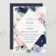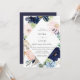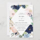 Elegant seashell and starfish, watercolor diamond shaped floral and foliage frame in elegant shades of navy blue, pink, dusty blue and green, wedding invitation. Back of card features coordinating navy blue colour.