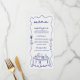 Charming and casual coastal theme wedding menu that features hand drawn doodles in nautical navy blue on an off-white background. Illustrations include champagne and wine cocktail glasses, sea shells, a table setting and a squiggly, wavy border. The text is in a handwriting style and can be customised with your menu options. On the reverse side is a couple's crest that you can customise with each of your first name initials. Perfect for a more informal beach or tropical theme wedding.