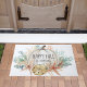 Welcome guests to your home with this coastal fall doormat featuring a watercolor pumpkin surrounded by starfish and sand dollar seashells, coral, palm and eucalyptus greenery in an earth-toned, autumn colour palette. The welcome message (shown here with Happy Fall) and second line of text can be personalised.