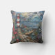 Coastal Lighthouse Throw Pillow. © Radenbrea Studios at Zazzle. A cushion with a coastal scene depicting the ocean, a lighthouse, a deck chair and a path with flowers alongside.