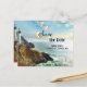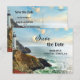 Save the Date postcard featuring a painting of a coast with a lighthouse in vibrant colors. Beautiful for a destination wedding or a wedding with a nautical theme.