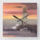 Square Wall Clock casual fun home furnishing decor accessory with Coastal Lighthouse With Pink And Orange Sky watercolor painting artwork design illustration by TheFabricSeal print on demand shop at Zazzle.com #ZazzleMade https://www.zazzle.com/store/thefabricseal If you’re lucky enough to be at the beach, you’re lucky enough. My love of the beach, ocean, outdoors, nature and watercolor painting comes together in the artwork image I enjoyably created. I hope you enjoy it as much as I do. Mixed media, watercolor painting and digital graphic design manipulation processes. Beautiful pink, orange, yellow, gold, golden, tan, sand, brown, grey, black, white, purple, blue and green colour palette scheme. All together in this seaside nature scene of a lighthouse sitting on a cliff side bluff, pounding waves crashing and splashing ashore, soaring seagulls flying overhead, pretty pink and purple sunrise / sunset backdrop in the background.