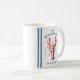 Coastal Lobster Beach House coffee mug features a white background with a red watercolor style Maine lobster and navy blue rope stripes. Personalise it with your family name and the date established in a classic navy blue font. Perfect for summer beach homes and waterfront cottages.
