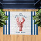 Coastal Lobster Seaside door mat features a white rustic wood background with a watercolor style Maine lobster. Personalise it with your family name and the date established in a classic navy blue font. Perfect for summer beach homes and waterfront cottages.