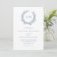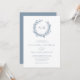 Perfect for beach and nautical themed weddings, a coral wreath frames the monogram initials of the bride and groom at the top of this elegant minimal white and dusty blue coastal invitation. The back is a solid dusty blue colour.