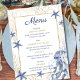Present your wedding feast with this elegant Coastal Wedding Dinner Menu Card. This menu features a striking navy blue and faux gold glitter border, adorned with watercolor starfish, sea coral, and a jellyfish. The luxurious design is perfect for a beach, yacht club, or seaside reception, adding an upscale maritime feel to your tablescape. Easily customize the template to list your Starter, Main, and Dessert courses. Perfect for a Coastal or Destination Wedding.