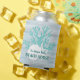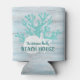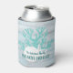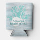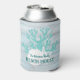 Perfect for beach parties, family reunions, weddings, and other events, this coastal themed personalised can cooler features a white sand dollar and 2 starfish with aqua glitter coral, on a rustic beach wood background.