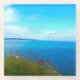 This glass coaster displays photography of a tranquil coastal view, where the flowers blow in the breeze and wisps of cloud float on the horizon.