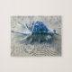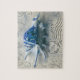 This coastal themed jigsaw puzzle features an indigo blue and white seashell with a name and postage stamp to be personalised on a background of beige with gold damask. Designed by world renowned artist Tim Coffey.