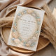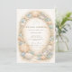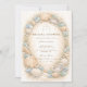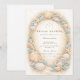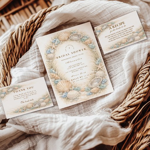 A refined coastal bridal shower design featuring an elegant oval wreath of seashells, oyster shells, starfish, and soft sea glass accents. Neutral sandy tones blend with muted ocean blues and delicate dune grasses to create a serene seaside aesthetic. The airy parchment background enhances the natural textures while maintaining a graceful, elevated look. Perfect for a beach-inspired celebration with timeless coastal charm.