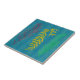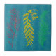 This coastal seaweed ceramic tile depicts 3 seaweed strands in red, yellow and green on a teal aqua turquoise wavy ocean background.
