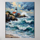 This painting presents a powerful scene of a white lighthouse with a red roof perched on a rocky cliff overlooking a tumultuous ocean. The artwork is defined by its thick, expressive brushwork and heavy impasto texture, which vividly portrays the powerful blue-green waves crashing against the shoreline. The sky above is filled with swirling, dramatic clouds, suggesting a coming storm. The lighthouse stands as a beacon of resilience against the raw, untamed force of nature.