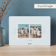 Chic coastal style holiday card adds nautical flair to your Christmas greetings. Perfect for sharing a vacation photo, or for families who live in coastal, tropical, warm weather or island locales, this elegant design features your favourite horizontal or landscape orientated photo on a background of blue and sea green watercolor stripes, with blue faux glitter at the top and bottom. Add your custom holiday message (shown with "seas and greetings") and your names or family name. Personalise the back with two additional photos and the year.