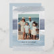 Chic coastal style holiday card adds nautical flair to your Christmas greetings. Perfect for sharing a vacation photo, or for families who live in coastal, tropical, warm weather or island locales, this elegant design features your favourite photo on a background of blue watercolor stripes, with a sprinkle of silver foil at the top and bottom. Add your custom holiday message (shown with "seas and greetings") and your names or family name. Personalise the back with three additional photos.