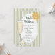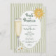 This whimsical coastal petals and prosecco bridal shower invitation features a vintage sun motif, lace border, palm trees, and stylish sage green stripe background. Perfect for a beach or California destination wedding theme event. Created by Simply Farmhouse Press.