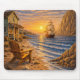 Bring warm seaside charm to your workspace with this scenic mouse pad featuring a glowing sunset, a tall sailing ship, and a peaceful shoreline cottage. A rustic Adirondack chair, gentle waves, rocky cliffs, and a seashell on the sand add inviting coastal detail to the tranquil scene. Rich golden light and deep blue water create a relaxing nautical atmosphere with a timeless, storybook feel. Perfect for anyone who loves beach sunsets, ocean landscapes, and classic seaside artwork.