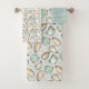 This coastal cool bath towel set for your beach house, patio, or salty abode features a pattern of soft cream and aqua watercolor oyster and pearl illustrations.