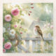 A soft watercolor scene captures a gentle songbird resting on a white garden fence surrounded by blooming pink roses, leafy vines, and warm morning light. The palette glows with pastel greens, blush pinks, creamy whites, and sunlit gold, creating a calm cottagecore atmosphere filled with quiet charm. Loose painterly brushstrokes and airy light give the artwork a whimsical folk feel, evoking peaceful garden mornings, vintage storybook illustrations, and romantic shabby chic beauty. AI generated artwork.