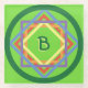 Squares in colors of the rainbow (orange, yellow, red, purple, blue) are stepped up in size from the center and twisted 90 degrees to look interwoven. A dark green circle encircles all of the squares and holds them down on the bright green background. Personalize the central initial which is also dark green, with a yellow drop-shadow.