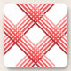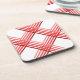 Red lines in varying five shades Dark to light, bottom to top. Four sets of stripes are placed diagonally, forming a square in the middle that is at right angles to the corners of the square coaster.
