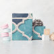 A seamless geometric pattern wrapping paper inspired by classic Mediterranean and Moroccan tilework. This design features elegant quatrefoil shapes in rich shades of cobalt blue, teal, and aqua, accented with light cream outlines and subtle marbled textures. The combination of deep ocean hues and cracked-stone details creates a timeless yet modern aesthetic. Perfect for those who love artistic geometry, coastal tones, and refined tile-inspired artistry that evokes both tradition and contemporary design.