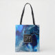 Deep cobalt blue and white swirls marble digital art monogrammed tote bag.