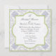 This vintage inspired wedding collection has a complete ensemble of products. This design consists of a detailed vintage carved etching pattern that has been made into the background. It has a toile damask feel to it. The gentle lime green border on a quatrefoil central design and outer edging give it a contemporary essensce and unpredictability. The artwork was painted in antiquity and rearranged into a pleasing colour palette and layout. A beautiful blue fringed iris, forget me nots, white hydrangeas and delightful small white and black butterflies complete the image.