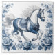 A cobalt charger, captured in a dynamic, mid-stride pose, graces this ceramic tile. Delicate blossoms intertwine within the intricate floral patterns adorning the horse's body, flowing mane, and tail. Its decorative saddle or harness echoes the same floral motif. The artist subtly emphasizes the animal's powerful muscles and fluid movement. A border of detailed floral designs in the same rich blue hue frames the scene. The symmetrical composition and slightly elevated perspective accentuate the horse's dynamic posture. Muted colours and diffused lighting create a serene, vintage atmosphere, reminiscent of classic tile artistry. This meticulously rendered design exudes a sense of timeless beauty and craftsmanship.