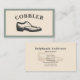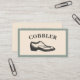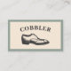 A simple & elegant business card with an illustration of a shoe and customisable information, in beige, black and green colours. Perfect for activities such as shoe repair, boot maker, heel repair, shoes shop, etc.
