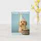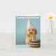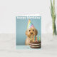 a cute cockapoo birthday card for those cockapoo lovers in your life or for anybody who loves cute dogs. cute dog with rainbow striped hat with a delicious looking chocolate birthday cake with candles