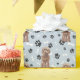 An image of a brown Cockapoo Dog is the feature in the pattern on this all occasion gift wrapping paper. The dog sits amid a pattern of black paw prints and white bones, and is repeated on a silver blue background.