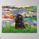 Water Lilies by Impressionist Claude Monet (1914), adapted to include a black Cocker Spaniel. One of many water lily paintings, this one has red or bright pink lilies in the pond. It sold at auction in 2008 for over 70 million.