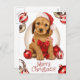 Cute english cocker spaniel puppy with Santa hat, peppermint candy cane, big red ribbon and christmas ornements, painted by artist Maryline Cazenave.
