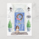 Announce your new address with our stylish announcement featuring a Brown Cocker Spaniel, blue front door, welcome mat, slate sign, topiaries and a floral wreath set on a grey brick background.