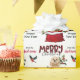 The repeated pattern on this cute Christmas wrapping paper is an image of a blonde Cocker Spaniel puppy dog peeking out from a red and white Holiday gift bag. Behind him is a sprig of holly and red berries. A red and black bullfinch bird is about to land. Stylised red and black buffalo plaid text says MERRY CHRISTMAS", and "Happy New Year" is in dark green. Your own signature is in two fields for you to customise.