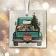 A teal blue retro pickup truck carries a decorated Holiday tree and gift packages on this cute glass Christmas ornament. Looking out from the tailgate is a beautiful buff coloured American Cocker Spaniel dog. A rustic wooden sign on the back bumper says "Christmas Cheer".