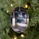 On a calm and sunny day, the waves of the Atlantic Ocean roll onto the beach and splash against the pilings of the the pier at Cocoa Beach, Florida. The front of this holiday ornament reads "Merry Christmas," and the back reads "Cocoa Beach, Florida." You can change either or both to suit your needs.